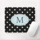 Dieses benutzerdefinierte Mauspad hat ein elegantes Monogramm in einem hellblauen ovalen Rahmen auf einem Hintergrund großer Polka-Punkte in antiken Weiß auf schwarz.