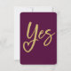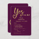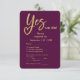 Ja Wir machen Pflaumengolden Hochzeitskarte Dieses elegante Pflaume- und Goldhochzeitdesign enthält den Satz "Yes we do!" mit dem Wort "Yes", das in einem romantischen Goldskript geschrieben ist. Das durchdringende Y enthält clever eine Herzform, die Liebe und Einheit symbolisiert. Das minimale schicke Layout verbindet kühne moderne Typografie mit zeitlosen Goldakzenten und schafft einen luxuriösen Look, der sich perfekt für feierliche Veranstaltungen, Pflaumenfeiern oder Abend-Hochzeiten eignet. Die Namen werden in anmutiger Kalligraphie angezeigt, was dieser edlen Schreibwarenhandlung eine Touch persönlichen Charmes verleiht. Dieses Design ist Teil einer individuell anpassbaren Hochzeitskollektion und wurde mithilfe von KI sorgfältig erstellt, um die Kreativität zu unterstützen. Ich verdiene eine kleine Provision durch Einkäufe, die über soziale Medien-Verweislinks getätigt werden.