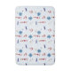 Eine hellblaue Badmatte mit einem themenorientierten Muster des schönen Jachthafens. Roter und weißer Leuchtturm, blaues Segelboot, roter Anker, Lenkrad des blauen Bootes und Seemöwen.