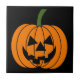 ein Jack O' Lantern aus einem orangefarbenen Kürbis mit schwarzen Dreiecksaugen, Nase und Zahnmund. Kann die Wörter "Happy Halloween!" oder "Trick or Treat!" enthalten, die bearbeitet werden können.