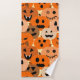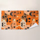 Dieses Set ist mit einem hellorangen Waschlappen, einem hellbraunen Handtuch und einem Badetuch mit Jack-oder-Laternen-Design ausgestattet, das in jedem Viertel wiederholt wird.