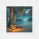 Ein glühender Ananas, der wie ein Jack-oder-Laternenbaum geschnitzt ist, liegt an einem sonnigen tropischen Strand unter Palmen