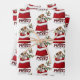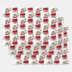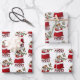 Das wiederholte Muster auf diesen Weihnachtsblättern ist ein Bild eines bezaubernden Jacks Russell Terrier Welpen, der aus einer rot-weißen Weihnachtsgeschenktüte herausguckt. Hinter ihm steht ein Gezeter aus heiligen und roten Beeren. Stilisierter, roter und schwarzer Büffel karierter Text sagt MERRY CHRISTMAS". Der Hintergrund auf zwei der Blätter in diesem Set ist weiß, während das dritte Blatt silber ist.
