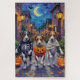 Adorable Jack Russells, die in verspielten Halloweenkostümen gekleidet sind, tragen Kürbiseimer, während sie unter dem mondbeleuchteten Himmel tricksen oder behandeln. Dieses festliche Design hebt die lebendige Haltung der Rasse, die hellen Augen und die energetische Persönlichkeit hervor, die perfekt die sprichwörtliche und dennoch lustige Atmosphäre Halloween-Abends einfängt. Eine spielerische Feier für Hundefreunde und Halloween-Fans gleichermaßen.