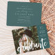 Die kühne und moderne Ankündigung und Party Einladung von Abschlüssen zeigt Ihr Lieblings-Foto mit "Graduate" überlagert in handskizzierter Pinseltypografie. Personalisieren Sie sich mit dem Namen, dem Jahrgang und der Schule des Absolventen auf der rechten Seite auf einer schicken Band von Juwel getönte jasper jade grün. Karten werden rückwärts gedreht, um die Details Ihrer Graduierungsparty in passenden Farben zu zeigen.