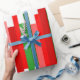 Dieses Verpackungspapier hat ein Weihnachtsmuster von Linien in Rot und Grün in verschiedenen Längen.