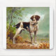 Jägerhund mit Vogel im Mund. Farbenfrohe Vintage zeichn. Retriever mit bunten Jägerfellen