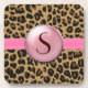 Chickorken-Rückseiten-Untersetzer, mit Grafiken eines schwarzen und braunen gepunkteten Jaguarpelz-Druckhintergrundes. Grafiken eines rosa Bandes, Läufe über der Mitte, mit einem rosa Knopf. Ein braunes Buchstabemonogramm, auf dem Knopf, ist bereit, für selbst oder als große Geschenkidee zu personifizieren.