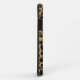Stilvolle iPhone 5 Gehäuse in einem gepunkteten braunen und schwarzen Jaguar-Druck. Die Grafik eines dünnen Goldbands in der Mitte ist mit einer schwarzen und goldenen Rundscheibe mit einem goldbraunen Monogramm aus einem Buchstaben geschmückt. Personalisieren Sie das Monogramm für sich selbst oder als Geschenkidee.
