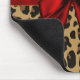 Stilvolle Mausunterlage mit Grafiken eines braunen und schwarzen Jaguarmusters, auf der unteren Hälfte der Mausunterlage und des festen roten Hintergrundes, auf die Oberseite. Ein roter Satin, der Band und Bogen schauen, Läufe über der Mitte der Auflage und moderner Jaguardruckstilett-Heels verziert die Spitze. Text im Tan ist bereit, für selbst oder als große Geschenkidee zu Ihrem LieblingsFashionesta zu personifizieren.