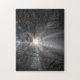 Ein Foto erfasst eine atemberaubende Szene eines dichten Waldes, der in ätherischem Licht gebadet wird. Die Sonne, versteckt hinter einem Nebel, strahlt strahlende Balken durch die Bäume und beleuchtet die mistige Luft. Die Äste der Bäume, die gegen das helle Licht gedämpft sind, schaffen ein Gefühl von Tiefe und Rätsel. Die Stimmung ist insgesamt ruhig und ruhig, was ein Gefühl von Frieden und Verwunderung hervorruft.