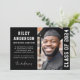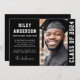 Moderne Abschluss Foto-Ankündigungskarte mit Ihrem Foto und dem Namen des Absolventen in einem modernen Uni Sportart-Schriftart. Weißer Text auf schwarzem Hintergrund. Farben und Schriftart sind im Designwerkzeug anpassbar.