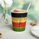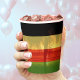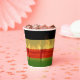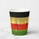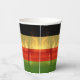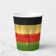 Jamaican Rasta färbt rot, grün, gelb, gold und schwarz Papier Becher mit Strand und Palmen Hintergrund. Ideal für einen Jamaika Urlaub oder Liebhaber der Insel / Karibik Kultur.