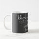 Dies ist eine wunderschöne, dunkelgraue und weiße, Christliche Kaffeekaffee-Tasse mit einem kraftvollen Bibelziffer von James 1:12: "Selig ist derjenige, der weiterhin vor Gericht steht"