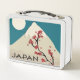 Grafische Abbildung eines japanischen Ahornbaums vor einem Berg mit einem Mond oben. Der Name Japan steht ganz unten in einem Deko-Schriftart.