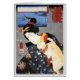 Utagawa Kuniyoshi war um 1797 geboren, der Sohn eines Seidenfärbers, der ursprünglich Yoshisaburō hieß. Offenbar unterstützte er das Geschäft seines Vaters als Musterdesigner, und einige haben angedeutet, dass diese Erfahrung seinen reichen Gebrauch von Farben und Textilien in Drucke beeinflusst hat. Man sagt, dass Kuniyoshi schon früh im Alter von sieben oder acht Jahren von ukiyo-e-kriegerischen Drucken und von Bildern von Handwerkern und Kommandeuren (wie in Handwerkshandbüchern dargestellt) beeindruckt war, und es ist möglich, dass diese seine eigenen späteren Drucke beeinflusst haben. Wunderbarer Ausdruck einer japanischen Frau, die eine Katze hält. Schöne und farbenfrohe Kimono-Kostüme.