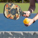 This retro look pickleball paddle features a Japanese style print -- similar to patterns from kimonos -- with white, teal, tan, and orange on dark teal-- almost black. Your monogram initial appears in gold text on a coordinated color block of dark blue teal, bordered by orange. This paddle a great gift for the pickleball dink queen or king on your list.