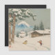 A serene Japanese winter landscape inspired by traditional ukiyo-e art, featuring Mount Fuji in the background, snow-covered pine trees, and a wooden house nestled in the scene. Cheerful children playing in the snow bring warmth and joy to this tranquil setting. Designed as a magnetic postcard for winter wishes, this artwork blends timeless Japanese aesthetics with a gentle festive spirit. Art by Alma Wad, created by the human in collaboration with Canva AI.