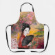 In der Schürze dieser Frau befindet sich ein wunderschönes Japanisch mit einer japanischen Hausszene, einer japanischen Frau mit traditioneller Kleidung und Sakura-Blüten.