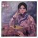 Dieses Design zeigt ein Gemälde des japanischen Impressionisten Fujishima Takeji (1867-1943). Es zeigt eine elegante asiatische Dame, die ein traditionelles Kimono trägt, das hauptsächlich rosa und mit einem schwarzen Muster lila ist. Sie ruht sich gegen einen Tisch, auf dem eine kleine Parfümflasche aufgestellt ist. Auf dem Tisch steht auch eine Vase aus rosa Rosen. Es ist ein Bild von zurückhaltendem Luxus und Eleganz.