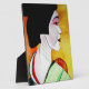 mit originellem Kunstdesign aus Aquarellmalerei von Sacha Grossel aus Japanisch Geisha mit grünem Kimono. Dieser Geisha ist im asiatischen, orientalischen und japanischen Stil inspiriert und hat einen gelben Hintergrund.