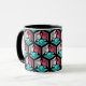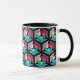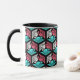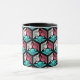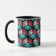 Tasse in einem klassischen japanischen Kimono-Muster aus stilisierten Kranen, in Hexagons in Korallenrot, Türkis und Weiß auf schwarzem Hintergrund angeordnet