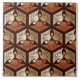 Keramik-Kacheln in einem klassischen japanischen Kimono-Muster aus stilisierten Kranen, in Hexagons in Bräune, Rost/Terrakotta und Creme auf dunkelschokoladenbraunem Hintergrund angeordnet