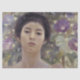 Dieses Design zeigt ein Gemälde des japanischen Impressionisten Fujishima Takeji (1867-1943). Es zeigt eine junge japanische Frau, die sich vor einem blumengeschmückten Hintergrund mit grünem Blattwerk und den violetten Blumen der Pflanze des Morning Glory lehnt. Die Dame trägt ein rotes Kleid. Sie hat einen entspannten Gesichtsausdruck; sie ist schön und elegant.