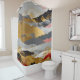 Eine ruhige, japanisch inspirierte Landschaft mit geschichteten Bergen und Bäumen, die durch schimmernde Golddetails geprägt ist. Diese elegante Komposition verbindet traditionelle Ästhetik mit moderner Abstraktion.