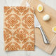 Küchenhandtuch in klassischem japanischem Kimono-Muster aus stilisierten, vierseitigen Medaillons mit Blätter und Blume in Mandarine Orange auf pastellorangefarbenem Hintergrund