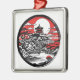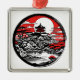 Abbildung eines japanischen Gartens mit Bäumen, Teich, Felsen und einer Pagode in Rot, Weiß und Schwarz, umgeben von einem schwarzen Grundumkreis