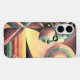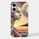 Farbenfrohe abstrakte Grafik einer Frau, die in Blume, Sonne und Sternen verziert ist, mit einem Aquarelleffekt und Texturen.