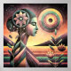 Farbige abstrakte Grafik einer Frau, die in Blume, Sonne und Sternen geschmückt ist, mit Aquarellwirkung und Texturen