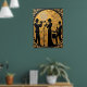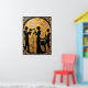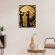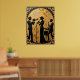 Dieses auffallende Bild zeigt ein Jazztrio in einem reichen, kunstvollen Deko-Stil. Die Musiker werden in schwarzen Silhouetten vor einem stark strukturierten goldenen Hintergrund gerendert, der mit aufwändigen Mustern und einem großen, stilisierten Mond geschmückt ist. In der Mitte steht eine Trompete spielende Frau, flankiert von zwei sitzenden männlichen Musikern, die Trompete und Tastatur spielen. Das Kunstwerk hat eine kühne, grafische Ästhetik, die den Glamour und die Eleganz eines klassischen Jazzclubs erinnert.