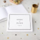 Ein edles Schwarz-Weiß-Gästebuch aus der Avery Suite mit einem dünnen, zweizeiligen Rahmen und sauberer Sans Serif-Typografie. Ideal für moderne, minimalistische Hochzeiten. Personalisieren Sie die Titelseite mit den Namen des Paares und dem Hochzeitstag.