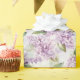 Das Umschlagpapier wird mit einem schönen lilakfarbenen Blumendruck gezeigt. Passen Sie dieses Objekt an oder kaufen Sie, wie es ist. Lizenzierte Printwerbung