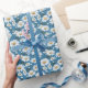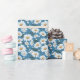 Das Umschlagpapier wird mit einem schönen blauen, dunklen Blumendruck gezeigt. Passen Sie dieses Objekt an oder kaufen Sie, wie es ist. Lizenzierte Printwerbung