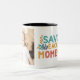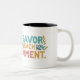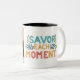 Genießen Sie jeden Augenblick Zwei-Tone-Kaffee-Tasse Ein buntes typografisches Design mit dem motivierend Zitat "SAVOR EACH MOMENT" umgeben von dekorativen blattähnlichen Elementen auf einem dunklen Hintergrund. Die Verwendung lebendiger Farben und künstlerischer Verzierungen macht dieses Bild optisch ansprechend und inspirierend.