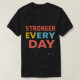 Ein lebendiges T - Shirt-Design mit der Phrase "Stronger Every Day" in fettfarbiger Typografie. Der Text ist dynamisch und auffallend angeordnet, wobei jeder Buchstabe eine andere, dynamische Farbe hat. Das Gesamtdesign vermittelt ein Gefühl von Stärke, Widerstandskraft und positivem Wachstum.
