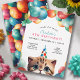 Ein kleines Kätzchen mit einem Party, das von Regenbogenballons umgeben ist, lädt zum bunten Geburtstag ein. Niedliche Einladungen, die in jedes Alter geändert werden können.