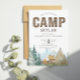 Diese lustige rustikale Einladung hat einen holzgetäfelten "CAMP" lustigen dekorativen Text. Der Boden hat einen Aquarellwald, Berge und Landschaft. Es ist mit den bräunlichen, grünen und braunen Camping, die ein Zelt und einen Kamin enthalten, geschmückt. Der Rücken hat ein Muster des gleichen Aquarellzeltes.