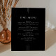 Dieses elegante, schwarze Hochzeitsmenü der Everly Collection zeichnet sich durch knallige Weißtöne, geometrische Deko-Akzente und redaktionelle Abstände aus. Die schlichten, dünnen Dreizeilentexte bilden einen eleganten Rahmen für ein raffiniertes, modernes minimalistisches, Abend-orientiertes Design.
