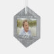 Ehre einen verstorbenen Lieben für die Ferien mit einem maßgeschneiderten Foto Imitate graues Holz hexagon-förmigen Glas Weihnachtsschmuck. Bild und Text auf dieser Vorlage sind einfach zu personalisieren. "Forever in unseren Herzen" kann man in "in liebevoller Erinnerung an", "an Engel im Himmel" oder in andere Worte ändern. (IMAGE PLACEMENT TIP: Eine einfache Möglichkeit, ein Foto genau so zu zentrieren, wie Sie es gewollt haben, ist es, es einzuschneiden, bevor Sie es auf die Zazzle-Website hochladen.) Das moderne Bauerndesign besticht durch eine rustikale, graue Holzrahmen aus Imitaten, eine elegante handgeschriebene Schriftzeichen-Kalligraphie, den Schriftstellertypografiennamen und die Jahre und ein Bild Ihrer Wahl. Dieser einzigartige und moderne Beileid-Sake macht eine durchdachte Begräbnisgeschenkidee und fügt den Xmas Zuhause-Dekorationen eine stilvolle Touch hinzu. Es ist eine elegante Art, einem verstorbenen Familienmitglied oder Freund Tribut zu zollen.