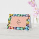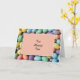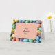 Ein naher, pastellfarbener Geleebohnen im Hintergrund und eine Korallenbox mit weißem Rand erwarten Ihre persönliche Nachricht