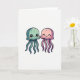 This design shows two cute, human-like jellyfish floating close together on a bright white background, as if they’ve drifted into a quiet moment just for each other 🥰. The jellyfish on the left is a calm teal-green with a rounded bell and flowing tentacles, dotted with tiny speckles that add texture. On the right, its partner is a soft blush-pink, matching the speckled pattern and trailing tendrils in a gentle, airy way ❤️. Both have oversized glossy black eyes, small curved smiles, and rosy cheeks that make their shared glance feel tender and friendly. A dark outline defines each shape and keeps the pair crisp against the open space. There’s no scenery around them, so the focus stays on their closeness and the way their tentacles seem to sway toward one another. No text appears anywhere on the front, leaving only the teal and pink characters centered with their speckled bells and dangling tentacles.