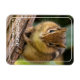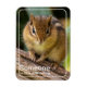 Ein niedlicher Chipmunk starrt von einem gefallenen Baumzweig aus scharf auf die Kamera.