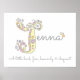 Hübsches j Anfangs-/Monogramm-individuelle Name-Poster, perfekt für ein Mädchenschlafzimmer oder Spielzimmer in Grautönen, Weiß, Gelb, Rosa und lila. Personalisieren Sie mit dem eigenen Namen Ihres Kindes, beginnend mit J, und Name bedeutet für eine wirklich personalisierte Touch für Ihr Kinderzimmer oder Kinderzimmer, dieses Beispiel ist für den Namen Jenna A kleinen Vogel, fair, himmlisch & eloquent. Niedlicher Plakatdruck ideal für ein neues Baby-, Taufen- oder Babyduschgeschenk. © Unique J Mongram Herzen und Blume zeichnend Beschreibung und Grafikdesign von Sarah Trett. www.sarahtrett.com für www.mylittleeden.com