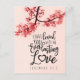 Die Postkarte mit inspirierenden Zitaten zeigt ein Naturfoto eines Zweiges von rosa Blume auf rosa Hintergrund. Es enthält einen Teil eines ermutigenden Bibelverses Jeremiah 31:3, "Ich habe dich mit einer immerwährenden Liebe geliebt." Foto von Patrick Shaun.