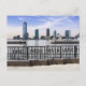 Ein schönes, grenzenloses Foto von Jersey City, New Jersey, direkt am Wasser, vom Yachthafen in Lower Manhattan, New York aus gesehen. "Man muss nie verlassen werden" ist auf der Vordergrundbahn skulptiert.
