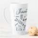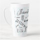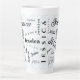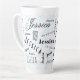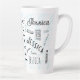 A typography custom name latte mug that uniquely highlights "Jessica" makes a memorable gift. The background pattern, created with the letter "J," is complemented by bold black, white, and light blue colors.